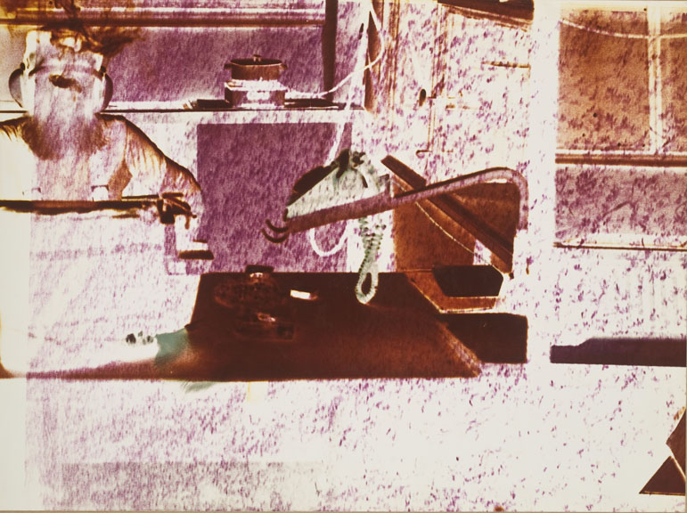 His participation was nearly banned before the opening: the organizers saw only that he had piled all sorts of things into his allotted space and then covered it with a cloth, so they could not imagine what it would turn out to be. In the end, in his box entitled Társasutazás – egyhelyben (“Group Travel – In One Place”), he presented a range of works created with different techniques. The installation included three self-portraits drawn on black paper against a black background—depicting himself as a child, a teenager, and his present self at the time—as well as his photo series Accidental Diamontages, which the audience could view on a Kodak Carousel projector. The series was created by superimposing two rolls of film: the first taken in Leninváros at the Experimental Workshop (with some fellow artists recognizable in the images), the second in Tatabánya, at his friend Viktor Lois’s place, where he captured almost lunar landscapes. Also part of the installation was a glass piece made in Leninváros and, reflecting on the title, he scattered the space with used tram tickets. He also played with light: he set up the lighting so that the lamp would occasionally switch on, alternately revealing either the exhibited objects or the projected images.